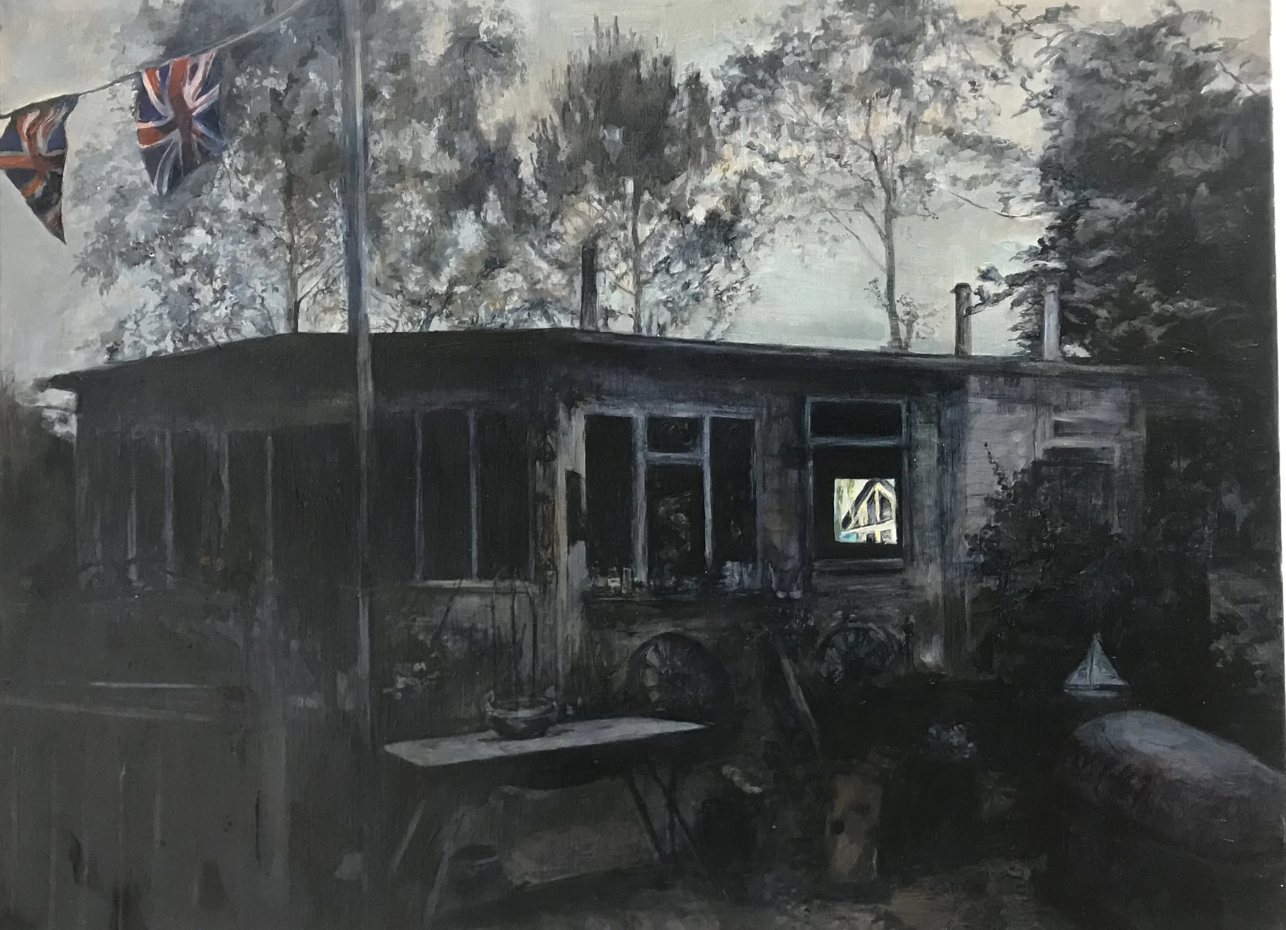 ‘At Bathroom Mirror (Descent)’ features my poem ‘Performance’. I made a series of paintings using the moat garden at Windsor Castle as the central motif. The under-painting was completed at an art competition held as part of the Queen's 90th birthday celebrations, and I wrote the poem musing about the anxiety of competition and the process of painting. The title refers to the start of the poem, and inheritance, the topographical features of a moat garden and the class structure of monarch to subject.